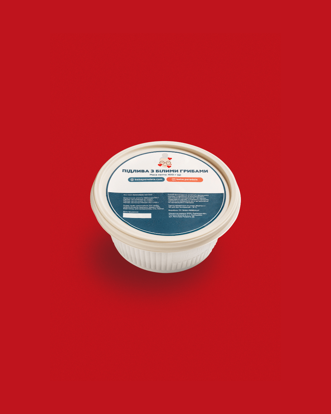 гриби шампіньйони (Agaricus) 12,5%, білі гриби сушені (Boletus edulis) 0,5 %, цибуля ріпчаста, борошно пшеничне, вершки 36%, вода питна, олія соняшникова, сіль кухонна, перець чорний мелений